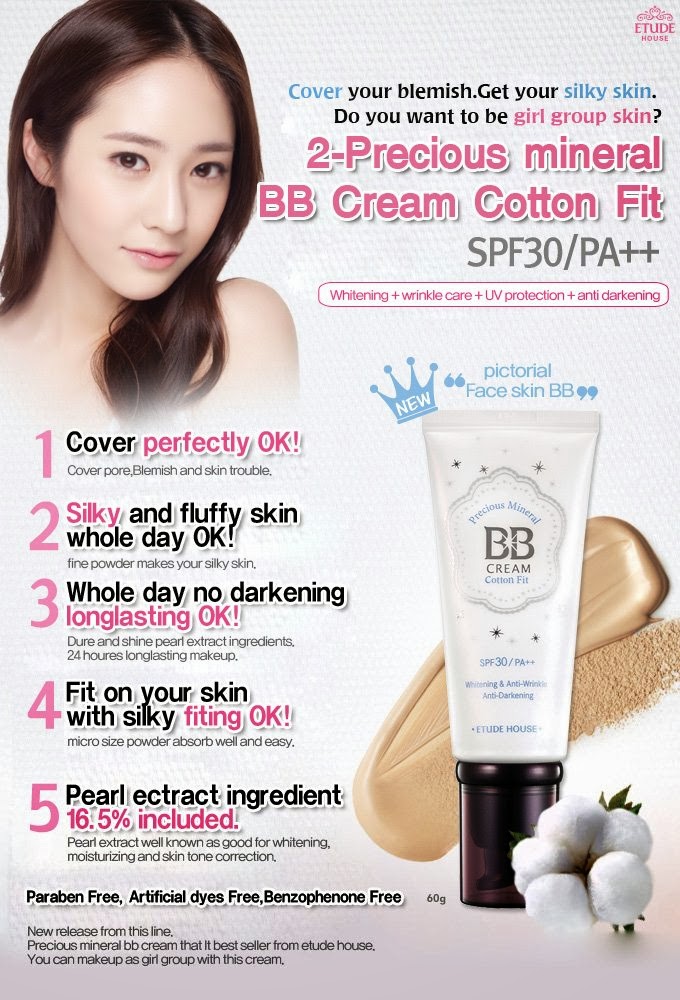 W zgrabnym opakowaniu z pompką przychodzi do nas 60g kremu BB. Krem ten należy do popularnej już linii "Precious Mineral BB Cream" z Etude House tym razem produkt ten został wzbogacony o ekstrakt z pereł oraz o puder bawełniany, który ma rozjaśnić naszą skórę i ukryć wszelkie skazy, krem ten ma być wolny od parabenów i "sztucznych barwników" oraz benzofenonu co czyni go przyjaznym skórze wrażliwej. Krem jak wszystkie bebiki które posiadam ma filtr w tym wypadku SPF30 PA ++, oraz właściwości przeciwzmarszczkowe i rozjaśniające.